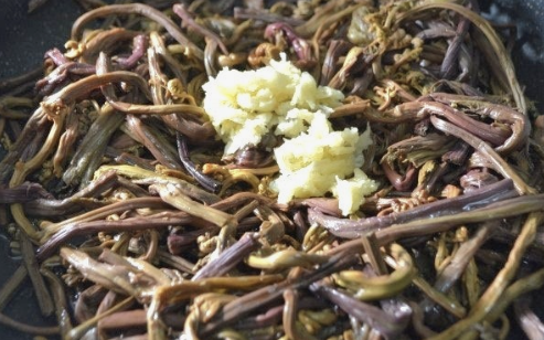 STEP 5. 팬에 들기름 3큰술을 두르고 중불로 달궈요. 양념한 고사리를 넣고 육수 1/2컵을 부어 뚜껑 덮어 중 약불에서 10분간 볶아요.