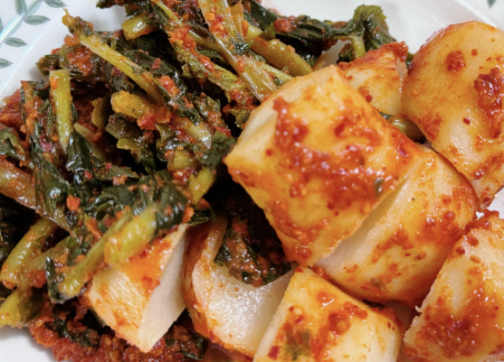 - 무엔 소금 많이, 잎엔 적게. 절임 속도가 달라요.